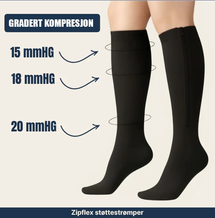 Zipflex støttestrømper med gradert kompresjon er utviklet for å støtte blodsirkulasjonen og bidra til redusert hevelse og ubehag ved daglig bruk.